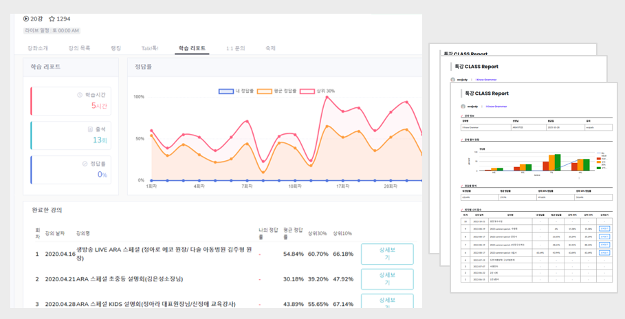 Based on the data accumulated from real-time quiz solving, you can compare the correct answer rate with learners studying the same curriculum, and after the real-time class ends, you can view only the necessary lecture points.